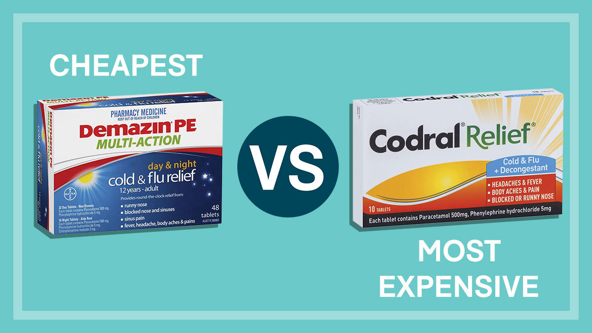 The cheapest way to buy pain relief and decongestant products is in 48 packs at pharmacies. Demazin PE Multi Action Cold & Flu Relief cost as little as 28c per pill at Chemist Warehouse.