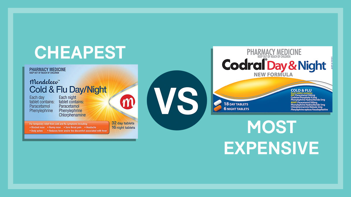 Mendeleev Cold & Flu Day/Night (48 pack) is 21c per pill at Chemist Warehouse. A 24 pack of either Codral PE Cold and Flu Day/Night or Sudafed PE Sinus + Pain Relief Day/Night costs 62c per pill at Amcal.