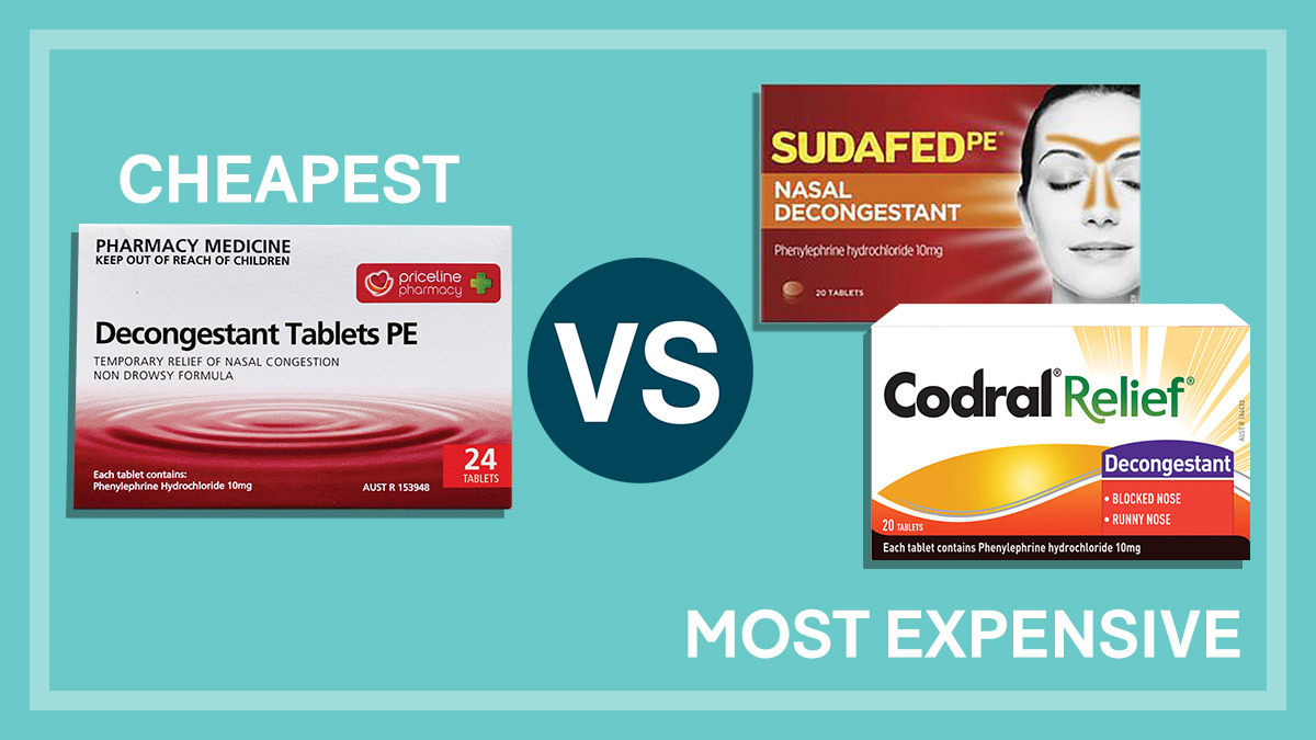 Brands compared: Amcal Nasal Decongestant PE, Codral Cold Relief Decongestant, Dimetapp Nasal Decongestant, Pharmacy Care Nasal Decongestant PE, Priceline Decongestant, Sudafed PE Nasal Decongestant.
