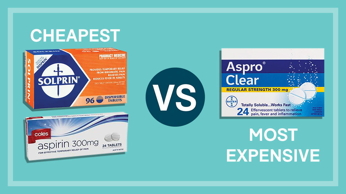 Cheap aspirin is available for 4c per pill at Coles and Woolworths (24 packs of Coles Aspirin and Essentials Aspirin) and Chemist Warehouse and Priceline (96 packs of Solprin). That’s 17c per pill less than the most expensive option: Aspro Clear (24 pack), which is 21c per pill at Coles, Priceline and Woolworths.