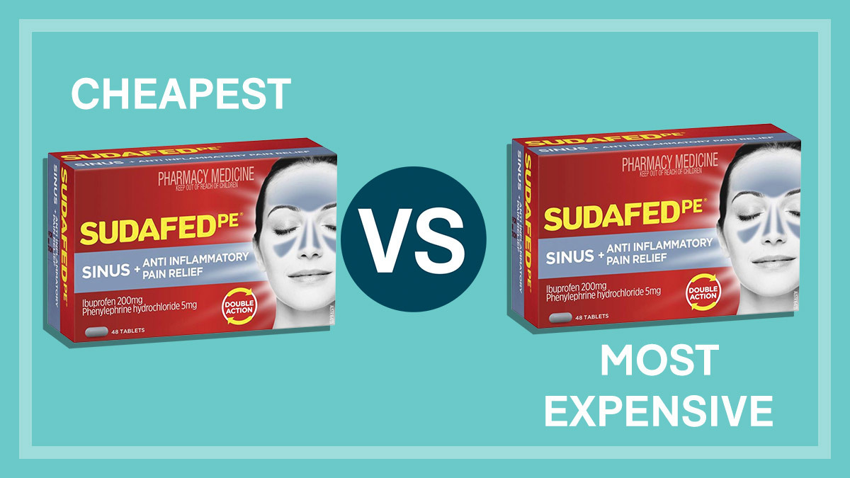 Sudafed PE Sinus + Anti Inflammatory Pain Relief is 43c per pill for a pack of 48 at Chemist Warehouse. A 20 pack of the same product costs about 78c per pill at Woolworths or Coles.
