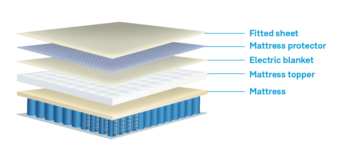So depending on the sheer volume of layers you normally put on your mattress, you’ll be up for an ordered layer of mattress > mattress topper > electric blanket > mattress protector > fitted sheet.