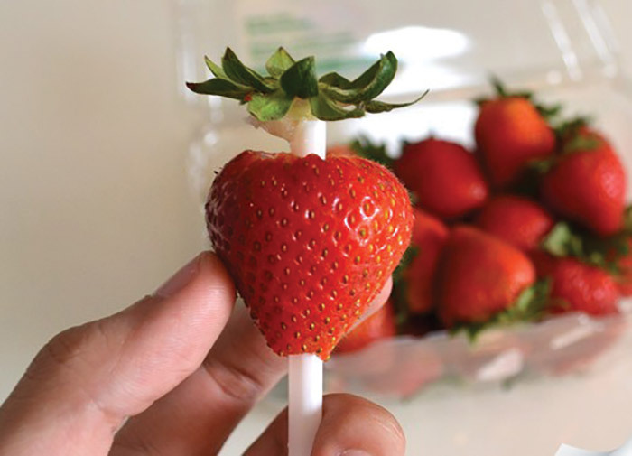 You push a plastic straw through the bottom of the strawberry to the top until the stalk pops out.