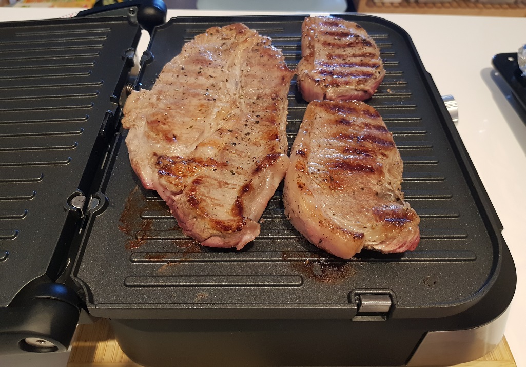 Steak: Matthew cooked several steaks on the Griddler following the manufacturer’s recommended instructions (which advise cooking with the lid closed and in sear mode for two minutes, after which the grill will revert to 200°C). While this speeds up cooking time, you can’t see how things are going until you lift up the lid.