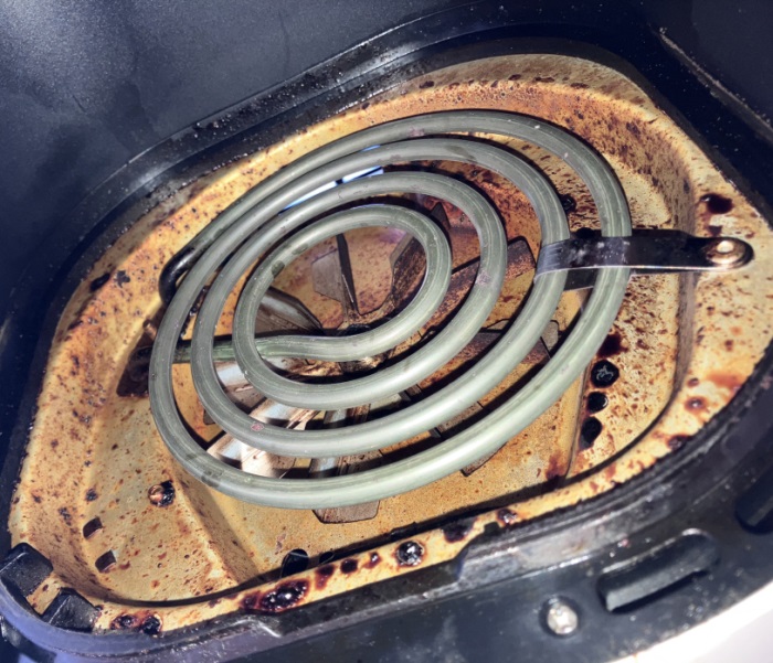 Make sure you check the manufacturer’s instructions about where your specific model’s element is located and how to clean it. You may need to turn the air fryer upside down to access it properly.
