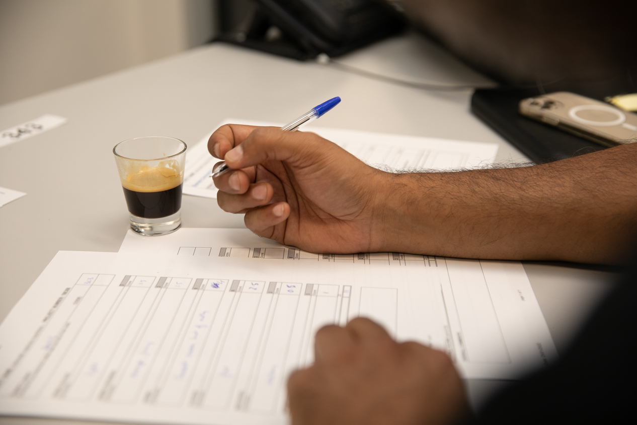 Three experts test the espressos in a ‘blind’ tasting, checking the colour and thickness of the crema (the tan-coloured foam on the top of an espresso shot), aroma, flavour, mouthfeel (for example, creaminess or wateriness) and aftertaste.