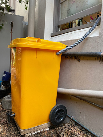 “We rigged it up with an inlet for the greywater extension hose near the top and a tap kit at the bottom. Our backyard is on a slope, so we can hook a regular garden hose up to the bin and gravity takes care of distributing the water onto the lawn.
