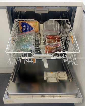- All that water. The thought of your dinner soaked with wash water, detergent and gunk from your dinner plates is pretty unappealing. But popping your ingredients in a ziploc bag protects them from all that (just to be safe, we double-bagged everything). Running the dishwasher to cook also means you can wash your dirty dishes while cooking your dinner – so you can plate up on pre-warmed plates from the same cycle! In fact it’s a good idea to pop some crockery in the dishwasher, because the fuller your machine is, the more stable the temperature, and stable temperatures make cooking easier.