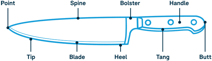 Knives may look like nothing more than a blade and handle, but there are actually quite a few components involved. The diagram below is a chef’s or cook’s knife.