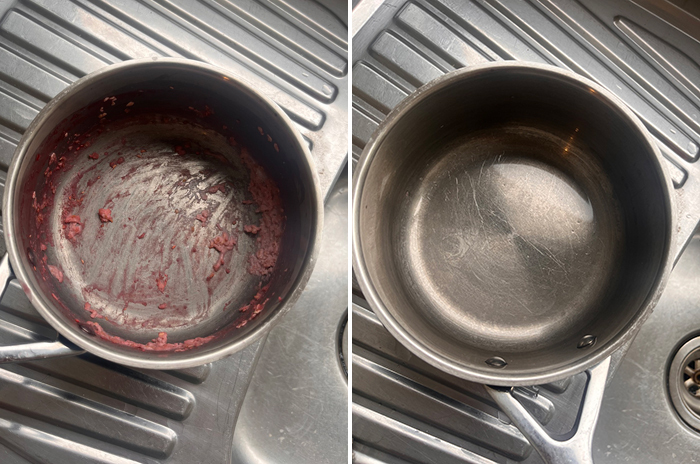 This writer tried the Scrub Daddy sponge on a stainless steel saucepan with fruit and porridge that had been cooked and left to cool for a few hours.
