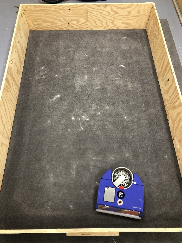Sand is sprinkled evenly onto a section of carpet and the robot runs for a set period of time on the carpeted area. The sand collected is weighed and recorded.
