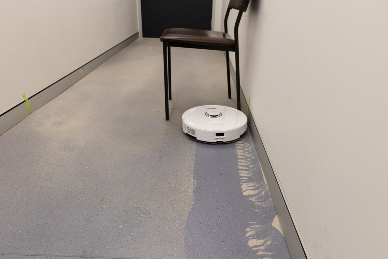 Sand is spread into a right-angled corner, and the robot vacuum cleaners are assessed to see how close to corners, chairs and table legs they can get to pick up the dirt.