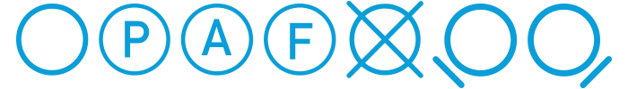 - Letters inside the circle (e.g. A, P, F) tell the dry cleaner which chemical and method to use.
