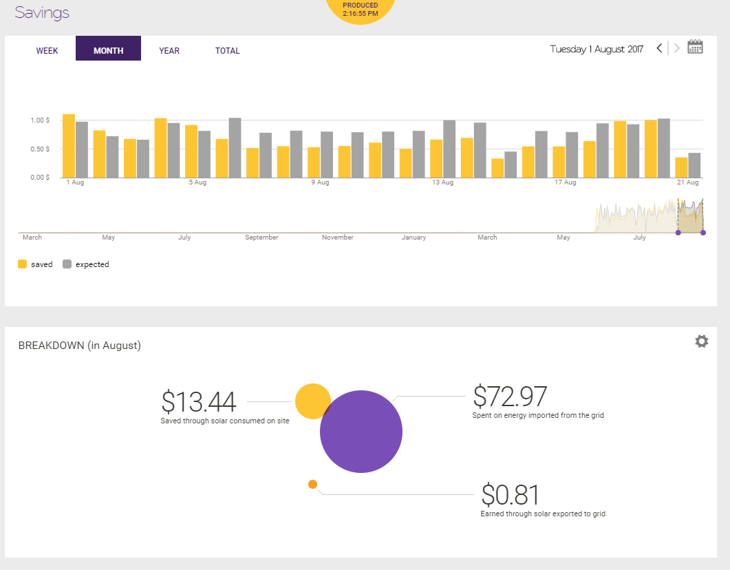 The information it gathers is merged with weather data and patented algorithms. It’s able to show real time and historical energy use and generation at a circuit level, as well as overall costs and savings if the electricity plan details are inputted.