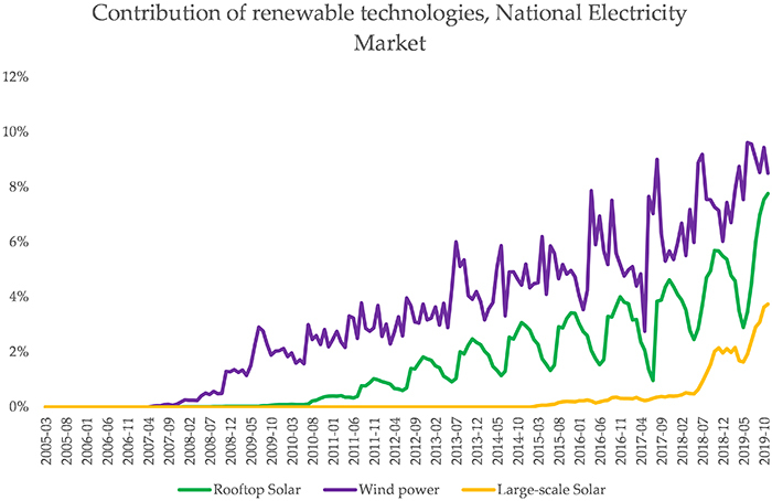 Australians have already been directly funding one of the fastest, largest-scale transformations in the world. The Renewable Energy Target scheme, running since the early 2000s, uses a small (between about 4–10%) environmental charge on bills to fund investment in renewable energy, including large wind and solar farms. Total renewables produced around 5% of the National Electricity Market (NEM) in November 2007, and 26% in November 2019.