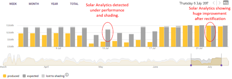 Graph from a Solar Analytics monitoring system showing daily output compared with expected daily output.