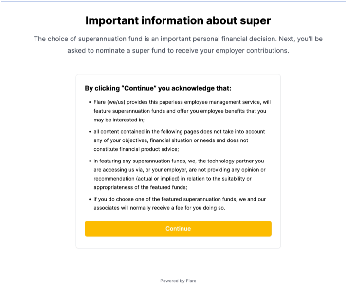 A CHOICE staff member also obtained a demonstration of the onboarding platform. In the demonstration, the user had to click through Slate Super and another fund that had paid to be featured before being given the option to stay with their existing fund. The CHOICE staff member felt a user might need to be familiar with superannuation guidelines or read the information presented thoroughly in order to know that they can retain their current fund.