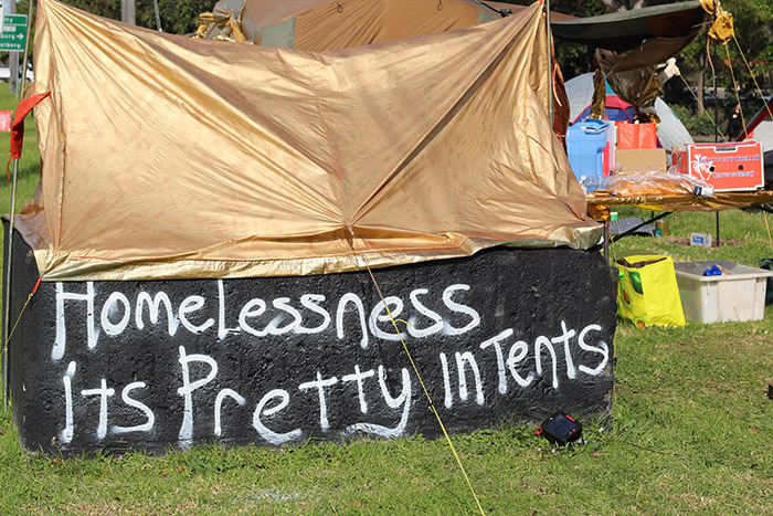 A median strip on a busy Melbourne peak-hour thoroughfare has been transformed into a mini tent city for National Homelessness Week, with a small group of protesters trying to draw attention to the housing and homelessness crisis.