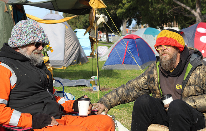 In the middle of Saint Georges Road in the suburb of Preston, around half a dozen people have been sleeping in tents for the week-long action. Protesters Shannon and Justin sit on camp chairs and share their thoughts behind setting up the site.