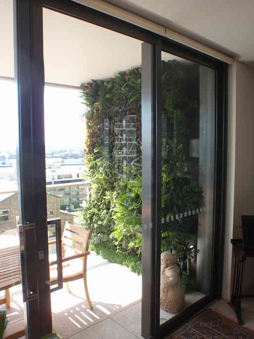 View of green wall garden through balcony doors