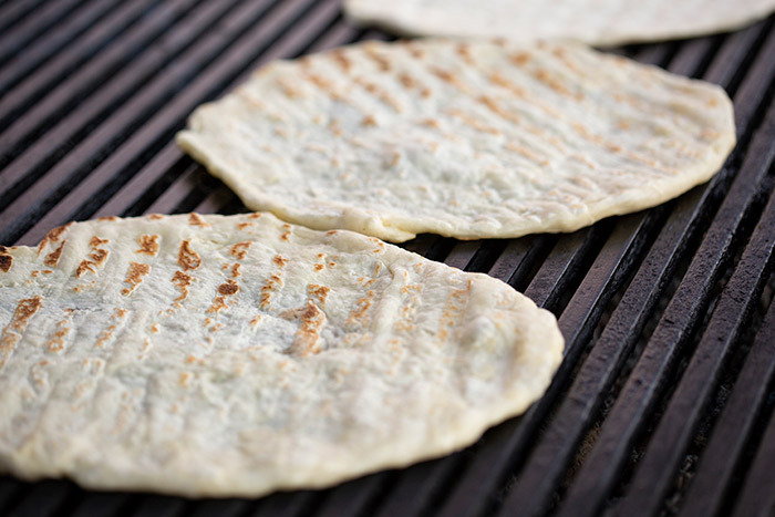 Heat the barbecue to medium and oil the grill. Lay out the flatbreads on the grill and cook for about 3 minutes on each side until they’ve browned. Ensure they’re slightly charred to get that real barbecue flavour.