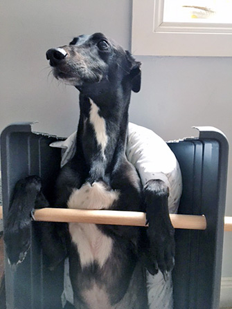 Rebecca and her partner now feed the dogs in a special cushioned chair they built (known as a Bailey chair) that allows the dogs to eat sitting upright.