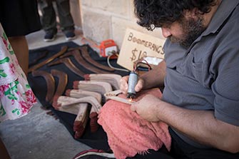 Glen Timbery sells souvenir-size throwing boomerangs for $10 that are made out of local plywood. He uses his family’s “burning-in” method to imprint each boomerang with a unique design.