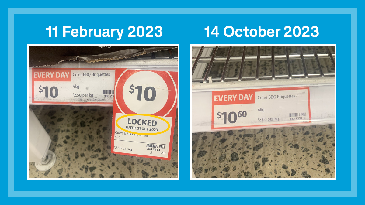The product that triggered the CHOICE complaint was the Coles BBQ Briquettes, 4kg, which had been advertised in February as being “locked” at a price of $10 until 31 October 2023, but had increased in price to $10.60 before the end of the advertised promotional period.