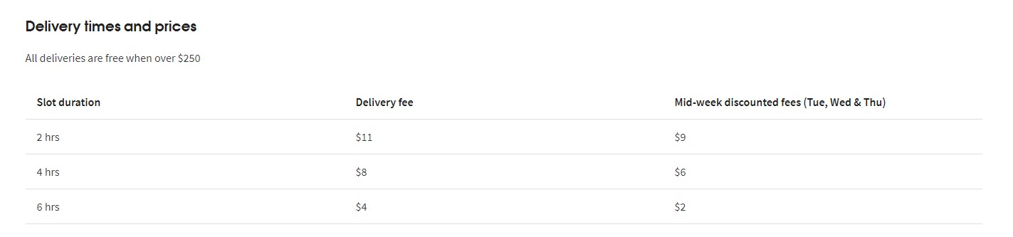 Coles keeps things simple with free delivery on all orders over $250 regardless of the day and delivery window.