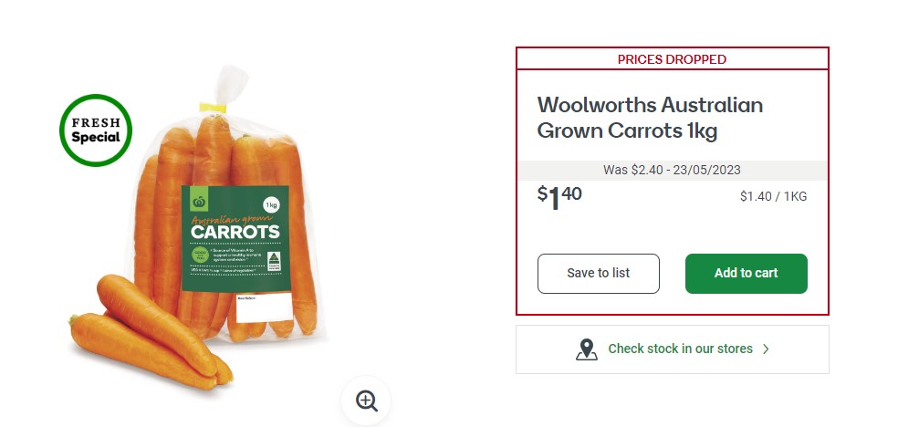 At the time of writing, Woolworths was selling carrots for 35 cents each and Coles was selling them for 42 cents each. But while Woolies only gives a price per unit, Coles also gives an approximate weight per carrot, plus a price per kilogram and a disclaimer that “Final price is based on weight.”