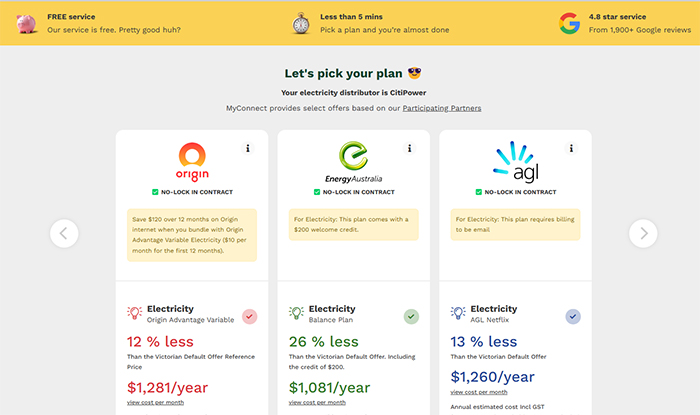 Reading from left to right on the web page, Origin was always the first option, followed by EnergyAustralia and AGL. The offers outlined the price you would pay per year along with the plan details.